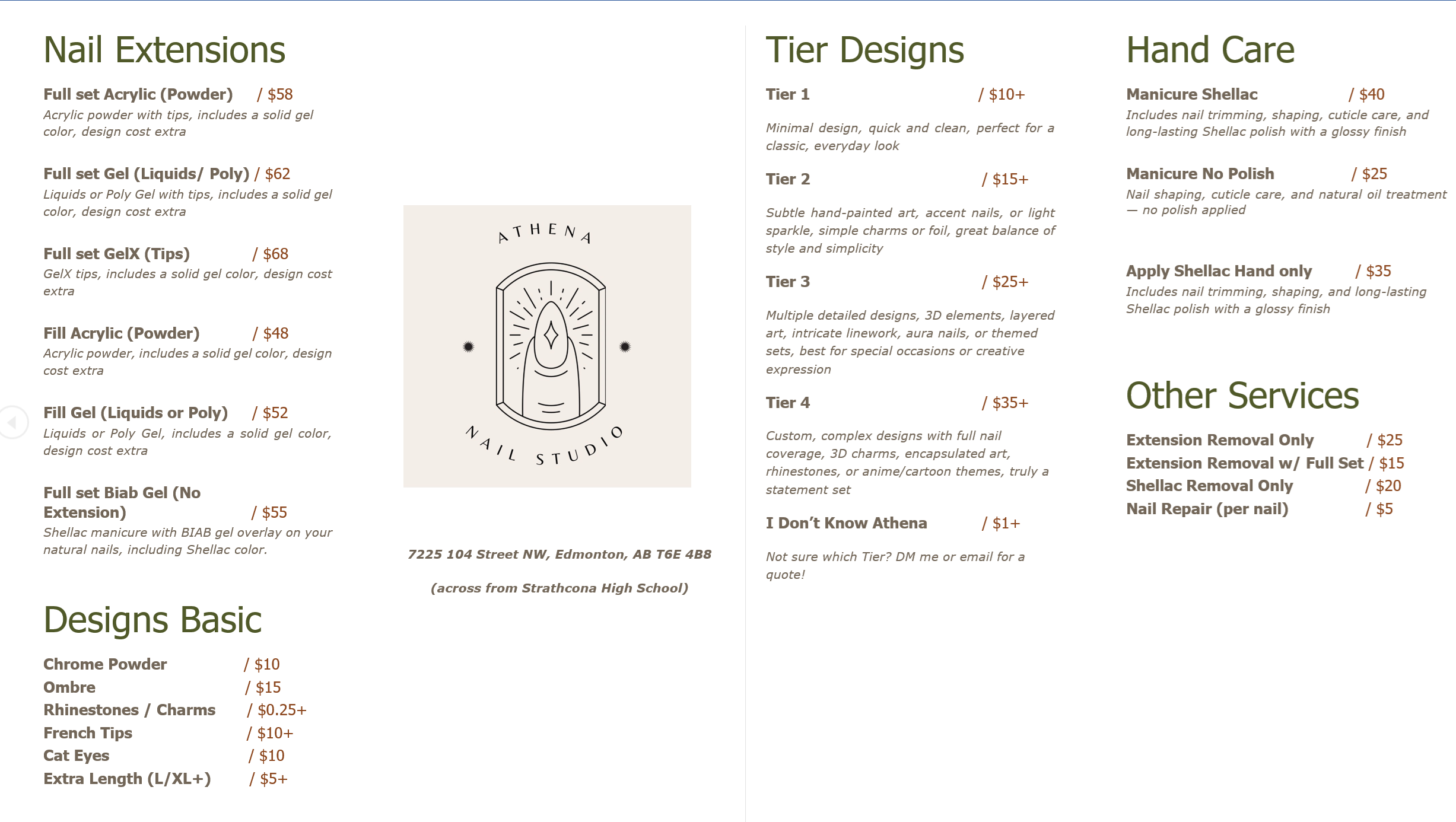 Please note that I only accept appointments and do not take walk-ins. If you need something urgently, feel free to text me at 780-266-8918. I’ll do my best to accommodate you 💕